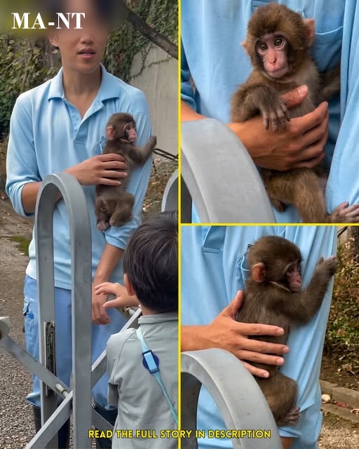 In this touching image, a baby monkey is seen clinging tightly to a young caregiver dressed in light blue. In one frame, the small animal rests against the person’s chest. In another, it looks up with wide, uncertain eyes while keeping one arm wrapped around the shirt. The final close-up shows the baby monkey still holding on, as if letting go is simply not an option yet.