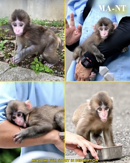 Across four gentle scenes, a baby monkey appears at different stages of care and recovery. In one frame, he sits on the ground, wide-eyed and alert, holding a small stem as if still learning about the world around him. In another, he rests safely in a caregiver’s arms, looking small enough to fit entirely inside one hand. A third image shows him lying down, clearly tired, leaning into human support. In the final frame, he appears curious again, reaching toward a bowl, suggesting the routine of feeding and daily care.