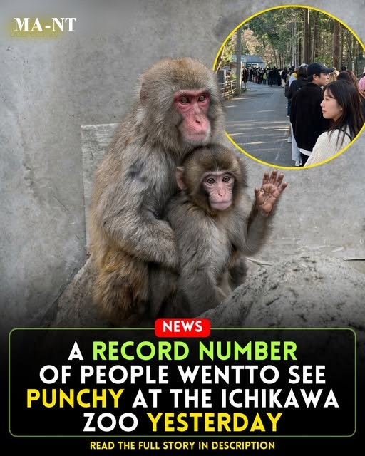 In the photo, Punchy appears tucked safely against an older monkey, looking out with wide eyes and one tiny hand raised as if waving to the crowd. The emotional image is paired with a claim that a record number of people came to see Punchy at Ichikawa Zoo, turning the young monkey into an unexpected star.