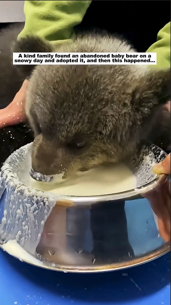 Soon, the tiny bear was given a bowl of warm milk and proper care. Hungry and tired, the cub eagerly drank, slowly regaining strength with every sip. For the first time in what must have felt like forever, the small animal was no longer alone or afraid.