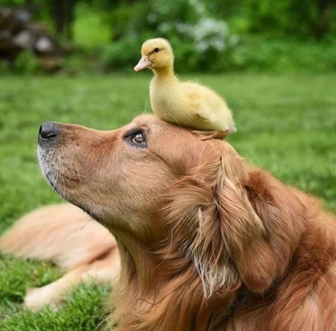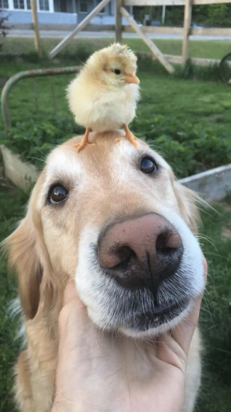 For the chick, the dog’s head may simply look like a warm and comfortable perch.