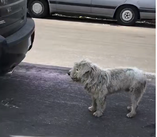 The dog, with its matted, unkempt fur and cautious posture, clearly shows signs of having lived a difficult life on the streets. Its body language suggests hesitation—standing still, slightly leaning forward, yet ready to retreat at any moment. This delicate balance between curiosity and fear is typical of stray animals that have experienced neglect or uncertainty around humans.