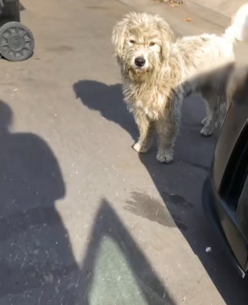 The dog, with its matted, unkempt fur and cautious posture, clearly shows signs of having lived a difficult life on the streets. Its body language suggests hesitation—standing still, slightly leaning forward, yet ready to retreat at any moment. This delicate balance between curiosity and fear is typical of stray animals that have experienced neglect or uncertainty around humans.