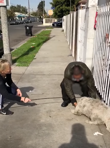 Symbolically, the interaction highlights the power of patience and empathy. The woman does not force contact or control the situation; she simply offers an opportunity. The dog’s response—edging closer, accepting the food—marks a silent agreement, a fragile but important breakthrough.
