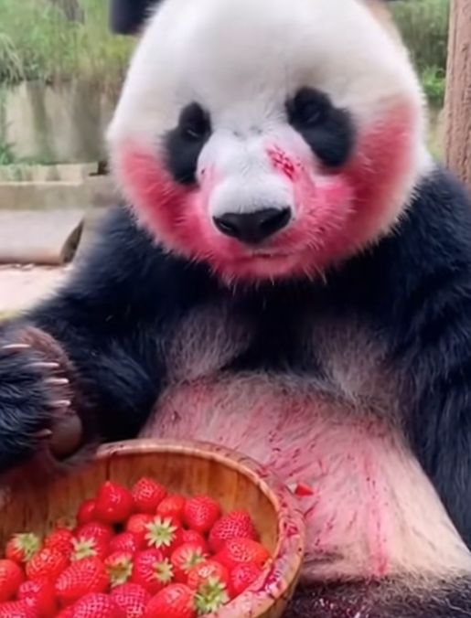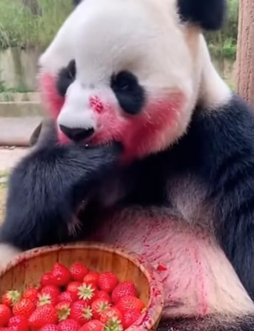 “Sweet Mess: The Joyful Indulgence of a Strawberry-Loving Panda”