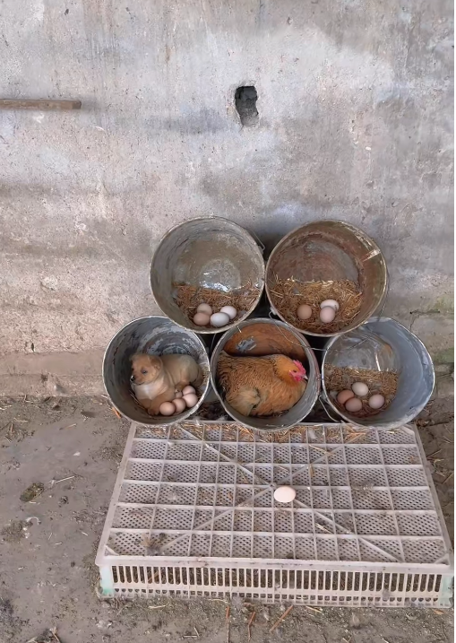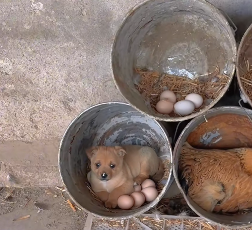 What immediately captures attention, however, is not just the presence of eggs or even the hen occupying one of the buckets—but the surprising inclusion of a small puppy curled up comfortably inside another nest, surrounded by eggs. This juxtaposition creates a moment that feels almost surreal. A space typically reserved for poultry reproduction has been shared—or perhaps claimed—by a completely different species.