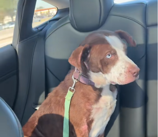 The setting—a car interior—signals a transition from danger to safety. It implies that she has been rescued and is now in the care of someone who recognized her condition and chose to intervene. The leash, while a tool of control, also represents protection in this context—ensuring she remains secure during transport, possibly on the way to medical attention.
