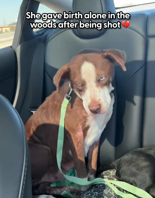 This emotionally charged image captures a quiet yet powerful moment inside a car, where a visibly exhausted dog sits on the back seat, secured with a green leash. Her posture is low and guarded, her body language reflecting both physical strain and emotional fatigue. The text overlay reveals a heartbreaking context: she gave birth alone in the woods after being shot. This transforms the image from a simple snapshot into a story of endurance, resilience, and maternal instinct.