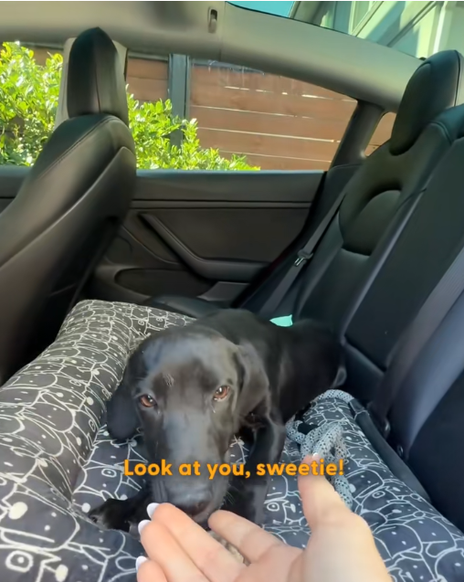 The setting—a car interior—signals a transition from danger to safety. It implies that she has been rescued and is now in the care of someone who recognized her condition and chose to intervene. The leash, while a tool of control, also represents protection in this context—ensuring she remains secure during transport, possibly on the way to medical attention.