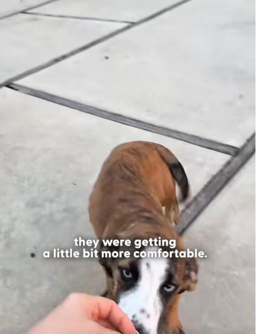 The dog’s eyes are perhaps the most striking feature. They appear heavy, almost distant, yet still alert—suggesting a complex mix of pain, confusion, and cautious awareness. Her ears are slightly back, a common sign of stress or uncertainty, while her body remains still, as if conserving what little energy she has left. Despite everything she has endured, she is present, alive, and responsive.
