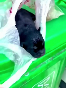 Found in a trash bag, a helpless and abandoned black puppy lay on top of a green dumpster. Left to fend for itself, it was exposed to the elements, vulnerable, and in desperate need of care. The puppy’s future seemed uncertain until a kind soul discovered it while walking nearby.