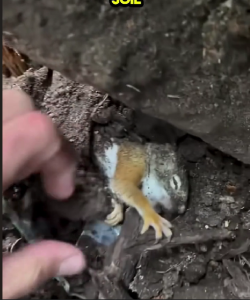 In the stillness of the forest, a small, fragile squirrel lay hidden under the ground. Its tiny body, weakened and in desperate need of help, had been trapped and left behind, abandoned by its mother. Unable to defend itself or find the food it needed, the little squirrel was at the mercy of the harsh world around it.