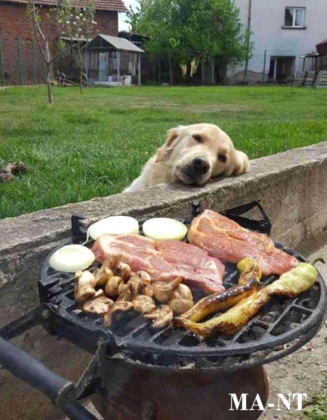 In a charming and relatable snapshot that’s making waves online, a Golden Retriever embodies every dog’s dream—eyeing a mouthwatering barbecue spread with unbridled longing. The photo depicts the fluffy golden-furred dog resting his chin on a low concrete wall, his soulful eyes fixed intently on the grill just inches away. The grill, a classic round black metal setup mounted on the wall, sizzles with an array of temptations: thick cuts of steak and pork, whole onion slices, clusters of browned mushrooms, and charred green peppers. Smoke wafts subtly, adding to the sensory allure. Set against a serene rural backyard with vibrant green grass, budding trees, a modest brick house, and a distant shed, the scene evokes lazy summer afternoons filled with family gatherings and outdoor fun.
