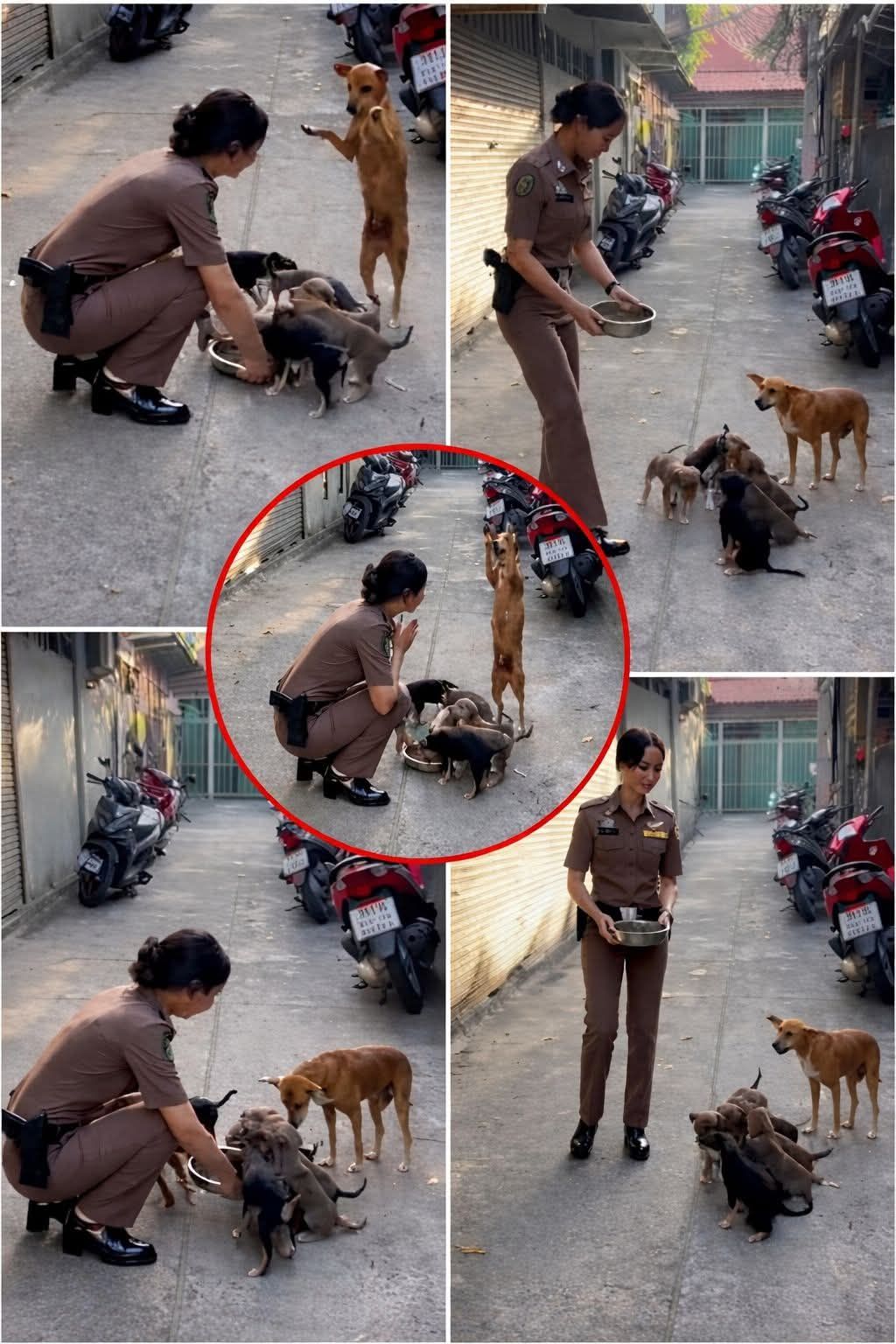 In a quiet corner of the street, she gently placed food on the ground, offering a warm meal to a stray mother dog and her tiny puppies 🐶🍼. There were no cameras, no spotlight — just a simple act of care.