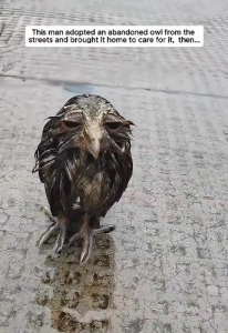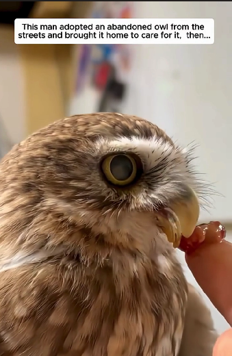 However, a compassionate man spotted the struggling owl and took immediate action. He rescued it from the streets, bringing it into his home, providing it with the care and safety it so desperately needed. The second image shows the owl in a much better state. With its feathers now clean and fluffy, and its eyes shining with alertness and curiosity, it sits calmly as it is fed by its rescuer. The man gently offers the owl food, and it eagerly accepts, signaling a clear sign of recovery. It’s a moment of transformation from fear and neglect to trust and security.