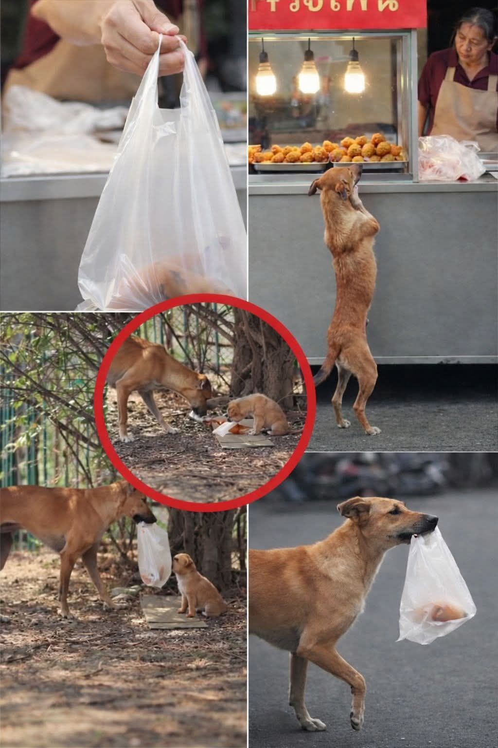 On a busy street corner, a thin stray dog stood up gently against a food stall, his eyes fixed on the food behind the glass. 🐶🍗 He didn’t bark, didn’t make a mess… just waited patiently, as if asking for a chance.