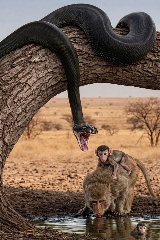 High in the tangled canopy of the jungle, a desperate moment unfolds between life and death. A terrified Monkey clutches her tiny baby close as a silent predator waits below. Hidden among the branches and shadows, a massive Python coils patiently, its cold eyes fixed upward. One wrong step on the fragile branches could send the mother and her infant tumbling into the waiting strike. In the wild, danger is never far away—and survival often hangs by a thread.