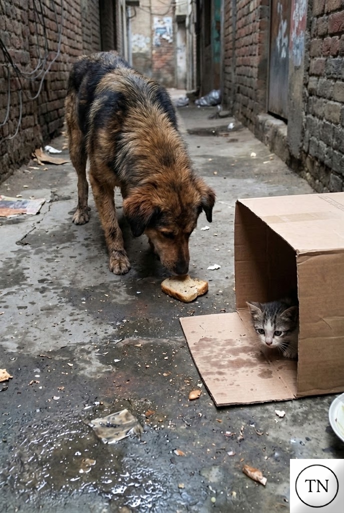In a dark alley, hidden inside a damp cardboard box, a tiny orphaned Kitten waited. The big dog carefully dropped the bread beside the fragile little cat, then lay down nearby like a silent guardian while the kitten ate with desperate hunger. Night after night, the dog gave away the only food he had, choosing to endure hunger himself so the small creature could survive the cold streets. In a world that can be harsh and unforgiving, this quiet act of sacrifice shows something powerful: kindness does not belong only to humans. Sometimes the purest empathy comes from those who have the least but choose to give the most
