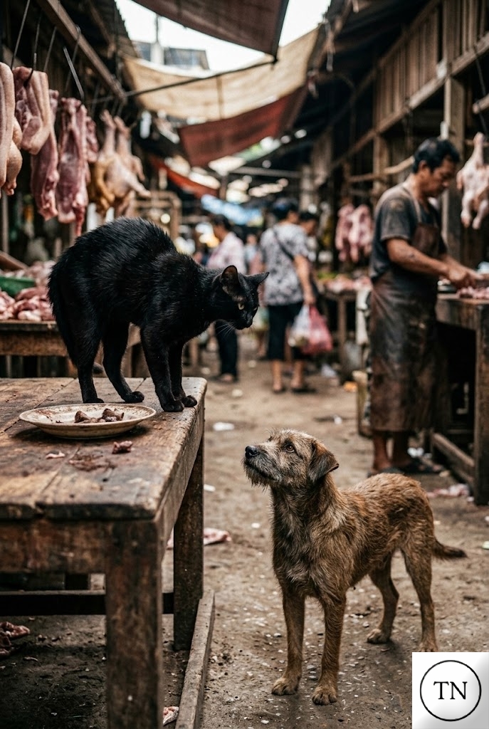 At a busy neighborhood market, a local butcher struggled daily with a frustrating problem. Stray Dogs would sneak close to his stall, sniffing and snatching pieces of meat whenever they found the chance. No matter how carefully he watched the counter, the clever street dogs always seemed to find a moment to strike. But one morning, something surprising happened. Out of nowhere, a large black Cat leapt onto the display counter, arching its back and glaring fiercely at the approaching dogs. When one bold dog tried to step closer, the cat hissed loudly and swiped its claws through the air with lightning speed. Startled and intimidated, the dog backed away and quickly ran off with its tail tucked between its legs.
