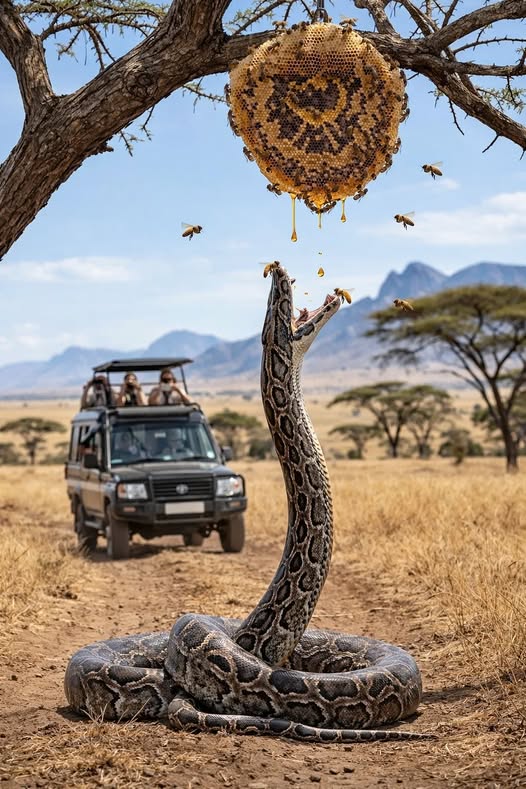 Imagine riding through the savanna on a safari jeep when you suddenly stop in disbelief. Right in the middle of the dusty road, a massive Python stretches its long body upward toward a hanging wild Honey Bee hive dripping with golden honey. Instead of stalking prey like the fearsome predator it’s known to be, the snake looks almost comical—reaching higher and higher as if it simply can’t resist the sweet temptation above.