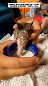 The second image shows the armadillo in a completely different light. Held gently in the hands of its rescuer, it’s now fed and cared for, nestled in the warmth of a loving environment. The little armadillo drinks milk from a small cup, showing signs of recovery and comfort. Its eyes, once filled with fear, are now alert, and the body that once seemed so fragile is beginning to show strength. This transformation, from an abandoned creature in a dangerous state to a well-nurtured animal, is the result of compassion, care, and immediate intervention.