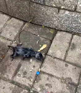 In the first image, we see a tiny, abandoned puppy lying alone on the cold pavement. Its small body is frail and vulnerable, and it’s clear that it has been left behind with no one to care for it. The situation looks grim as the puppy struggles to survive in an unforgiving environment, likely without food, warmth, or protection. The path ahead for this fragile creature is uncertain, but hope shines through in the form of kind-hearted people who notice the puppy’s plight.