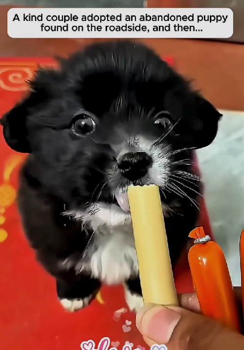 In the second image, we see the incredible transformation of the puppy, now safe and cared for in the hands of a loving couple. The little puppy, once helpless and abandoned, is now enjoying a treat, its eyes full of curiosity and joy. It’s a powerful moment of change, showing the puppy’s recovery from its difficult start in life. Wrapped in warmth and love, the puppy’s condition improves, and it is now thriving in the safety of its new home.