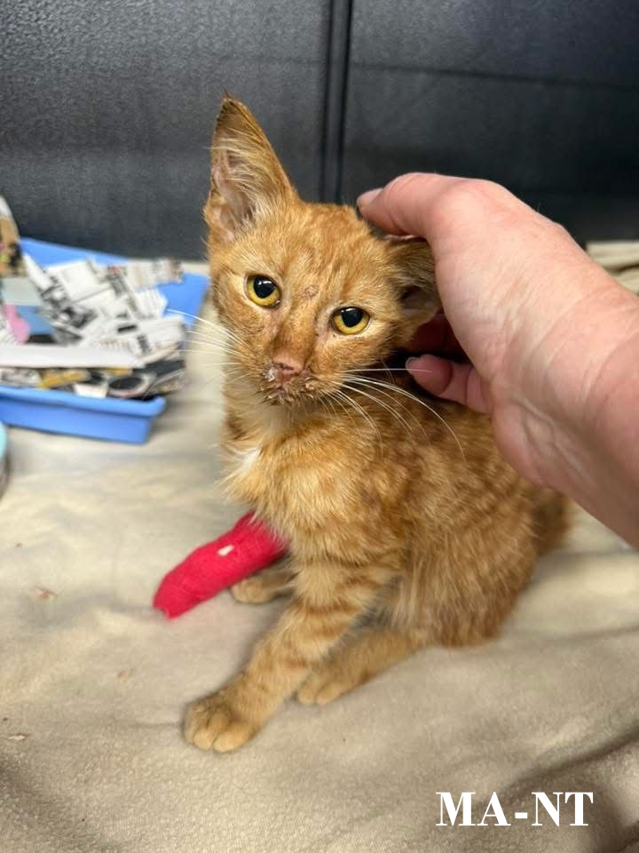 In a dimly lit shelter room, a small orange tabby kitten named Ginger sits quietly on a soft blanket, her golden eyes wide with a mix of vulnerability and hope. A human hand gently strokes her head, providing a rare moment of solace amid her visible wounds. Scabs mar her nose and face, suggesting possible infection or trauma from exposure, while her right front leg is securely bandaged in red, indicating a recent injury—perhaps from a fall, animal attack, or neglect. Nearby, a blue bin filled with shredded newspapers serves as an improvised litter area, underscoring the makeshift care in overburdened animal rescues.