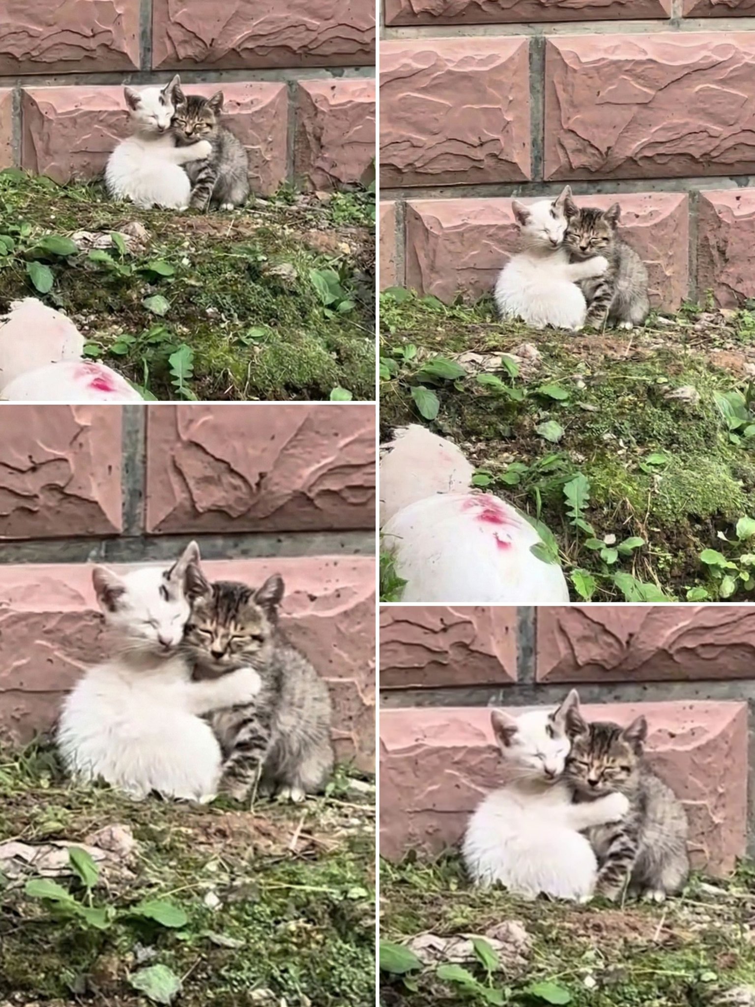 In a quiet corner, tucked beside a worn wall, two tiny stray kittens sit pressed close together. There’s no shelter above them, no soft blanket to keep out the cold—just the fragile warmth they share between their small bodies.