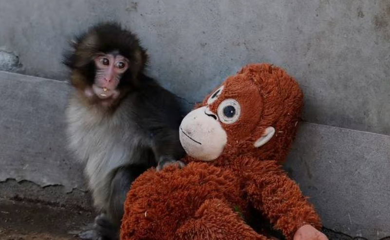 This image captures a deeply emotional and thought-provoking moment inside what appears to be a zoo enclosure on a rainy day. At the center of the scene is a small monkey, soaked from the rain, sitting quietly on a wooden beam. What makes the image truly powerful is not just the setting—but what the monkey is holding.