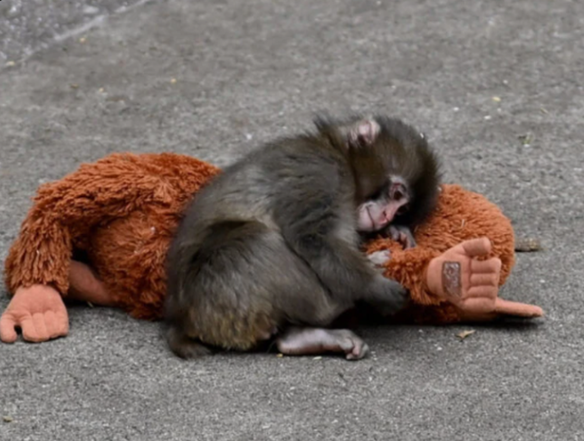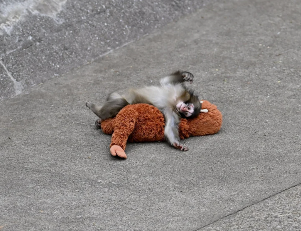 Clutched tightly in its arms is a small stuffed toy, shaped like another animal. The monkey presses its face gently against it, eyes closed, as if seeking comfort, warmth, or perhaps something deeper—connection. This simple act of hugging transforms the image from an ordinary zoo snapshot into a profound reflection of emotion and vulnerability.