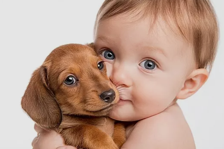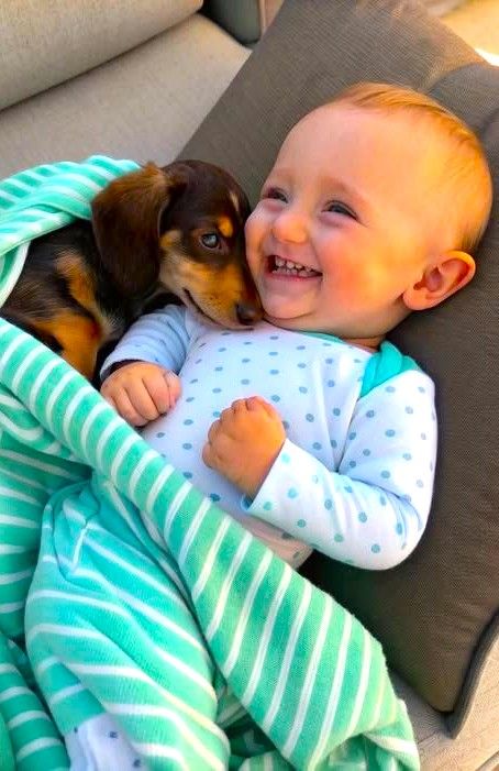Nestled closely beside the baby is a small dog, likely a young dachshund, gently pressing its face against the child’s cheek. The puppy appears calm, affectionate, and completely at ease. Its eyes are soft, and its posture suggests trust and comfort. Rather than being playful or energetic, the puppy is tender—almost protective in the way it leans in.