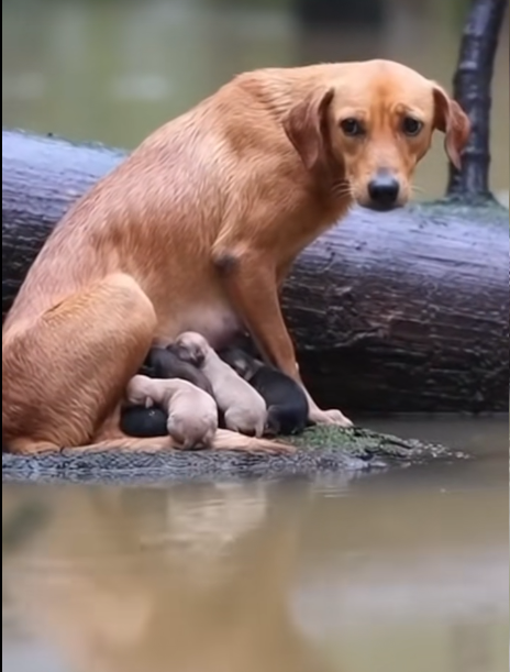 Her body becomes their shelter. Her warmth becomes their protection. Every drop of rain that hits her back is one less drop that reaches them. Every second she remains standing is another second her puppies stay alive.