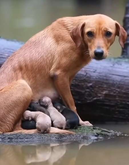 Her body becomes their shelter. Her warmth becomes their protection. Every drop of rain that hits her back is one less drop that reaches them. Every second she remains standing is another second her puppies stay alive.