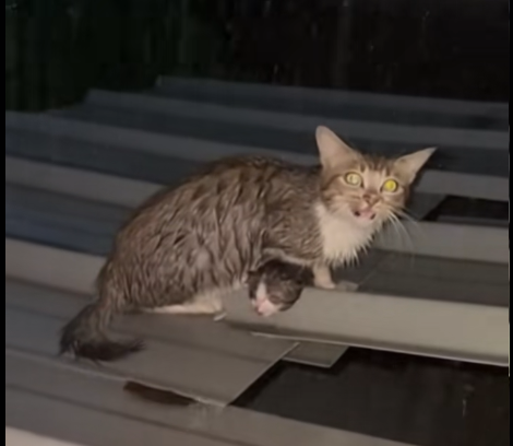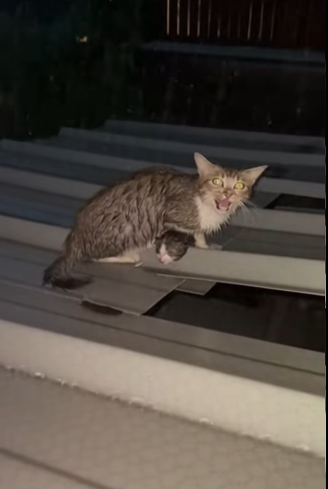 From a neighbor’s window, a heart-stopping scene unfolded. A mother cat stood atop a metal roof that was giving way beneath her feet, fully aware of the danger, yet focused entirely on protecting her tiny kittens. Below, floodwaters surged, threatening the safety of her little ones.