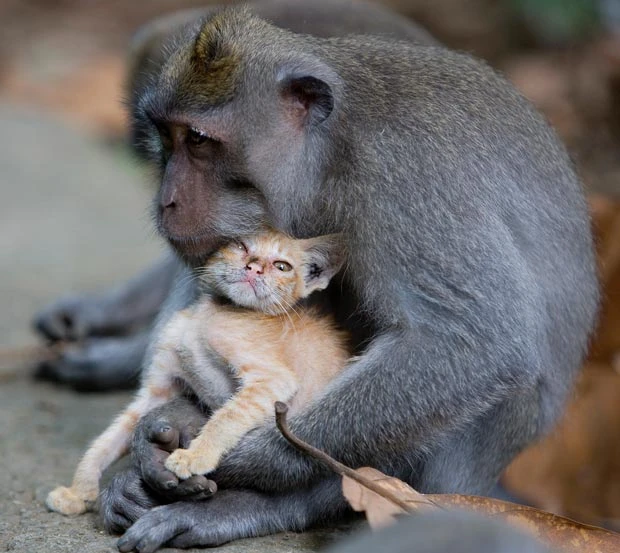 Observers described the monkey as protective and affectionate, often wrapping its arms around the kitten as if it were providing the warmth and safety a mother normally would.