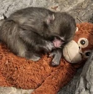 The tiny Japanese macaque who went viral for clinging to a stuffed orangutan. The baby monkey whose photos spread across the internet after he was rejected by his mother.