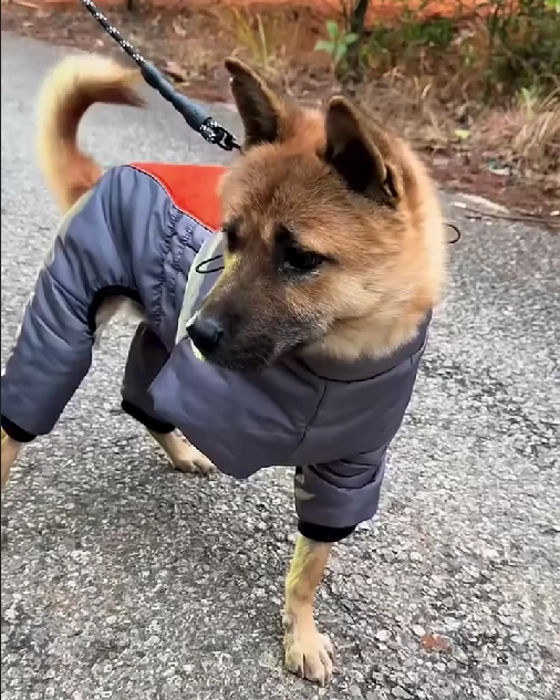 The second image shows the dog in a completely different environment—now dressed warmly in a coat, out for a walk with its rescuer. The dog’s once limp leg is supported by the care and attention it’s been given, and though it’s still recovering, it’s now safe and loved. The warmth of the coat not only protects the dog from the cold but symbolizes the protection and comfort it now receives, away from the harshness of the streets.