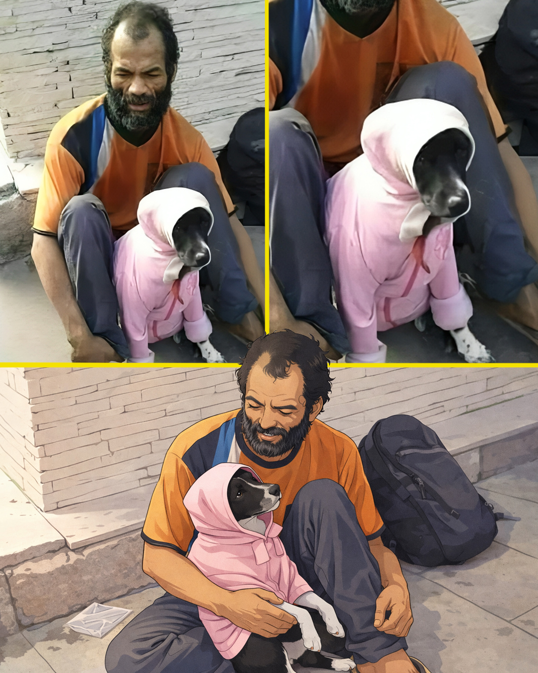 The small dog follows him everywhere. She eats what he manages to find, rests wherever he rests, and stays close, as if she knows she is safe as long as she is by his side. And he, despite having so little, gives her everything he can—his warmth, his protection, and his unwavering love.