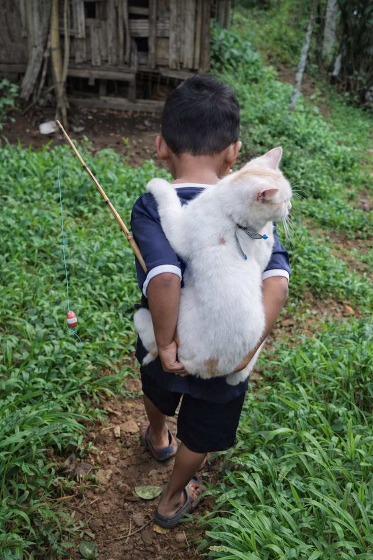 The boy, seen from behind, appears calm and focused on the path ahead. His small frame contrasts with the cat he carries, yet there is no sign of struggle. Instead, there is a quiet confidence in the way he holds his friend, suggesting this is something he has done many times before. The cat, rather than resisting, seems completely at ease—its body language showing a deep sense of safety.