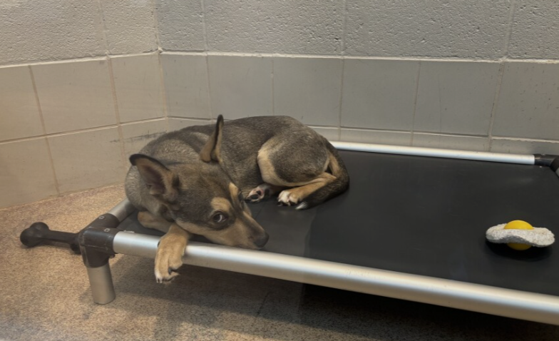 In a quiet corner of a shelter room, a tiny dog rests peacefully on a raised bed, wrapped snugly inside a soft blanket covered in white stars. At first glance, the scene looks almost like bedtime at home—except this little dog is still waiting for a family of his own. 🐶⭐