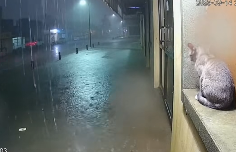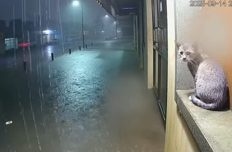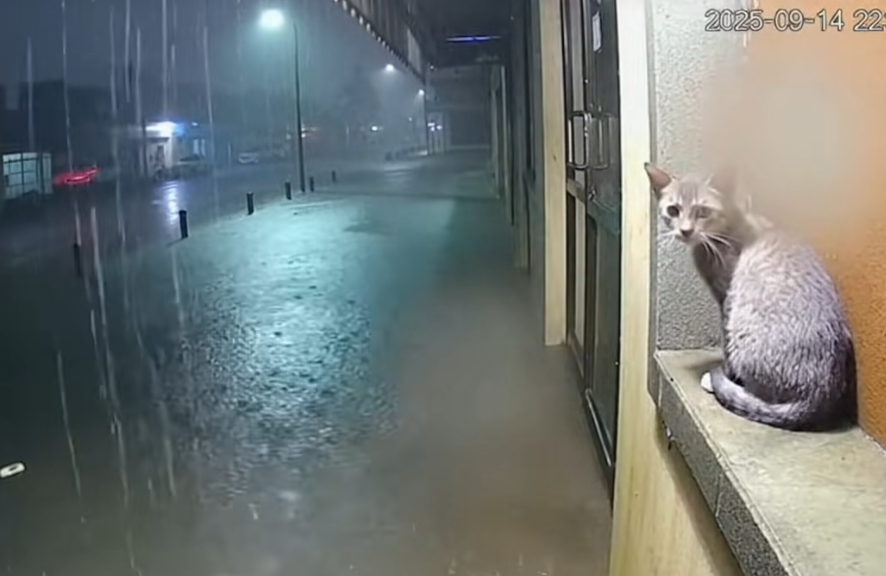 The cat’s eyes remain alert, watching the rain fall as if measuring time. Each passing minute brings the hope that the storm will weaken, that the sky will clear, that it can finally step out again into a safer world.