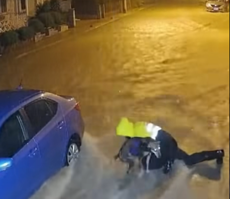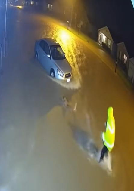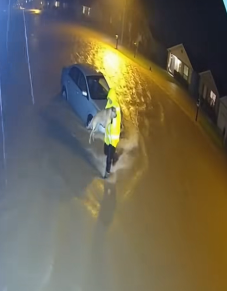 Then, in the distance, movement. A person spotted the stranded animal, noticing the urgency of the situation. Without hesitation, the rescuer moved toward the flooded area, carefully navigating the dangerous terrain. Each step required caution—the water was unpredictable, and the risk was real.