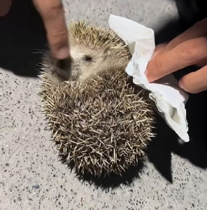 In these touching images, we see the heartwarming journey of a little hedgehog being cared for with love and attention. 🦔 The first picture captures a moment of compassion as a hand gently cleans the hedgehog with a tissue. Its small body, covered with sharp quills, stands in stark contrast to the gentle care it’s receiving. Hedgehogs, often misunderstood and feared due to their spiny appearance, are truly fragile creatures that need our protection and care. When found in distress, these little animals, like the one in the image, deserve to be given a safe and loving environment where they can heal.