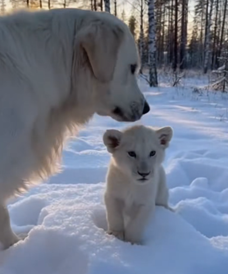 Without hesitation, my dog sprang into action. Brave and determined, he raced through the snow, dodging branches and deep drifts, until he reached the frightened lion cub. Using his warm body and gentle nuzzles, he guided the little one toward safety, shielding it from the bitter wind and helping it find solid footing 🐶❤️.