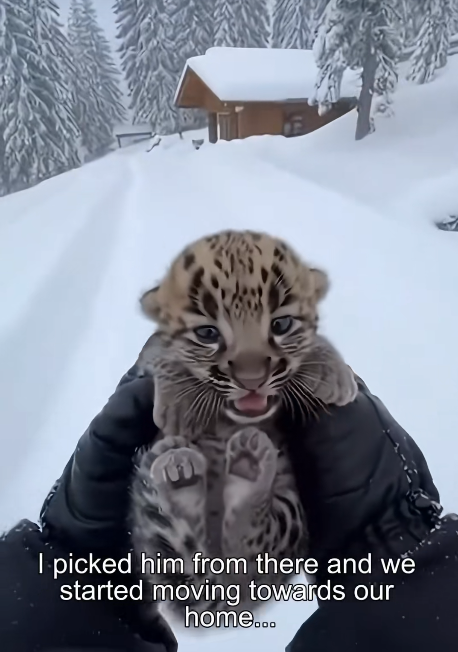 While hiking in the remote mountains, I stumbled upon a small, orphaned snow leopard, shivering and alone. The little cub was weak and frightened, likely separated from its mother during the harsh conditions of the high-altitude wilderness. It was a fragile life hanging in the balance.