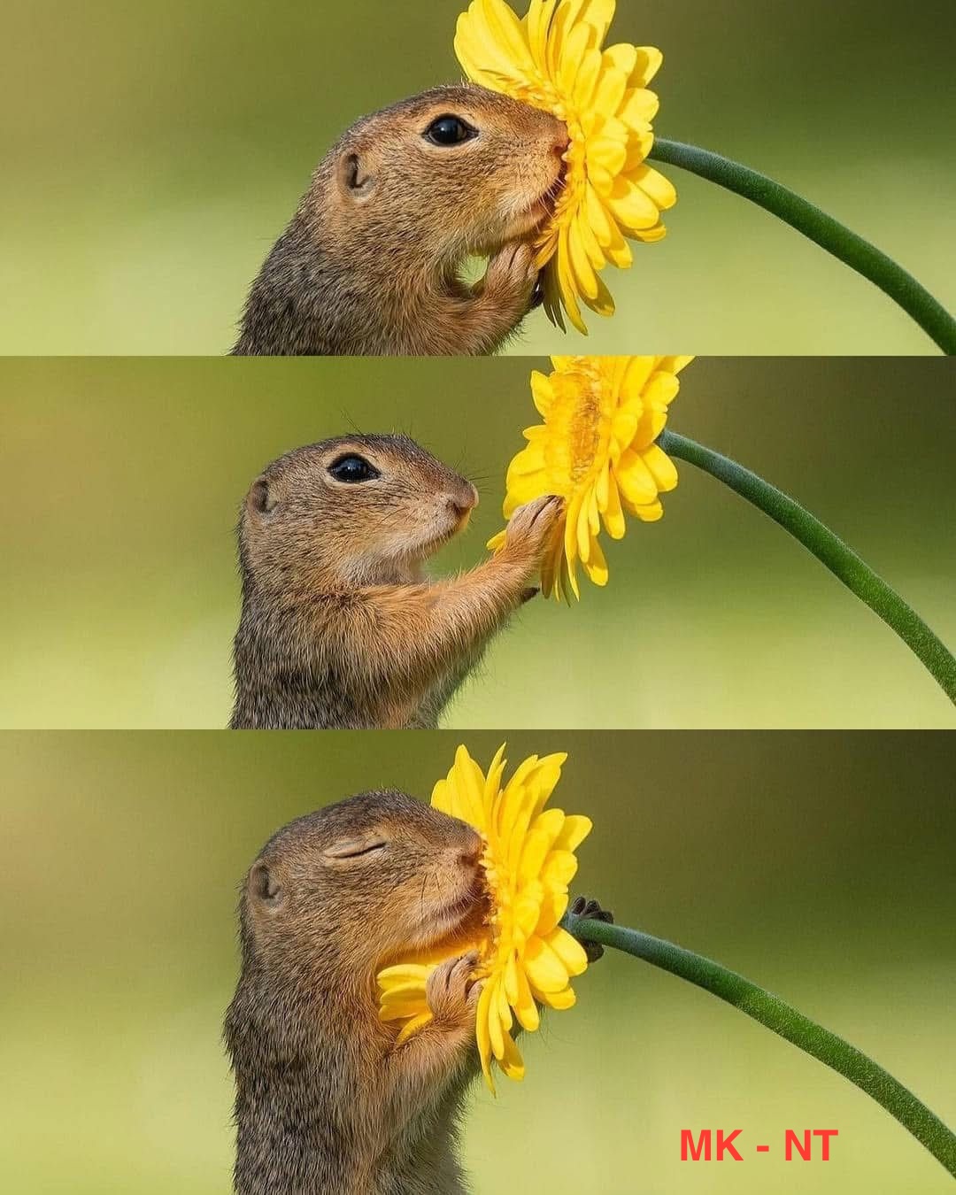 In this adorable scene, a tiny squirrel notices a bright yellow flower. At first it looks curious, sniffing the petals and gently touching them with its small paws. ๐ผ