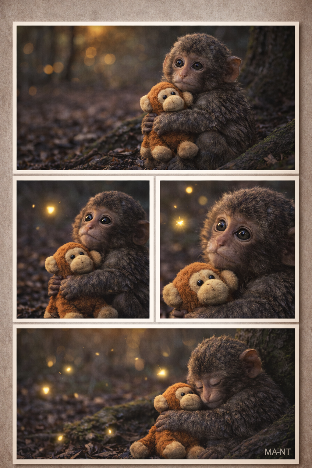 At the beginning of the story, Punch is alone. The forest is quiet, but not in a comforting way. It is the kind of silence that makes every rustle feel important and every shadow seem alive. He clutches his toy tightly, trying to hold on to whatever sense of safety he can find.