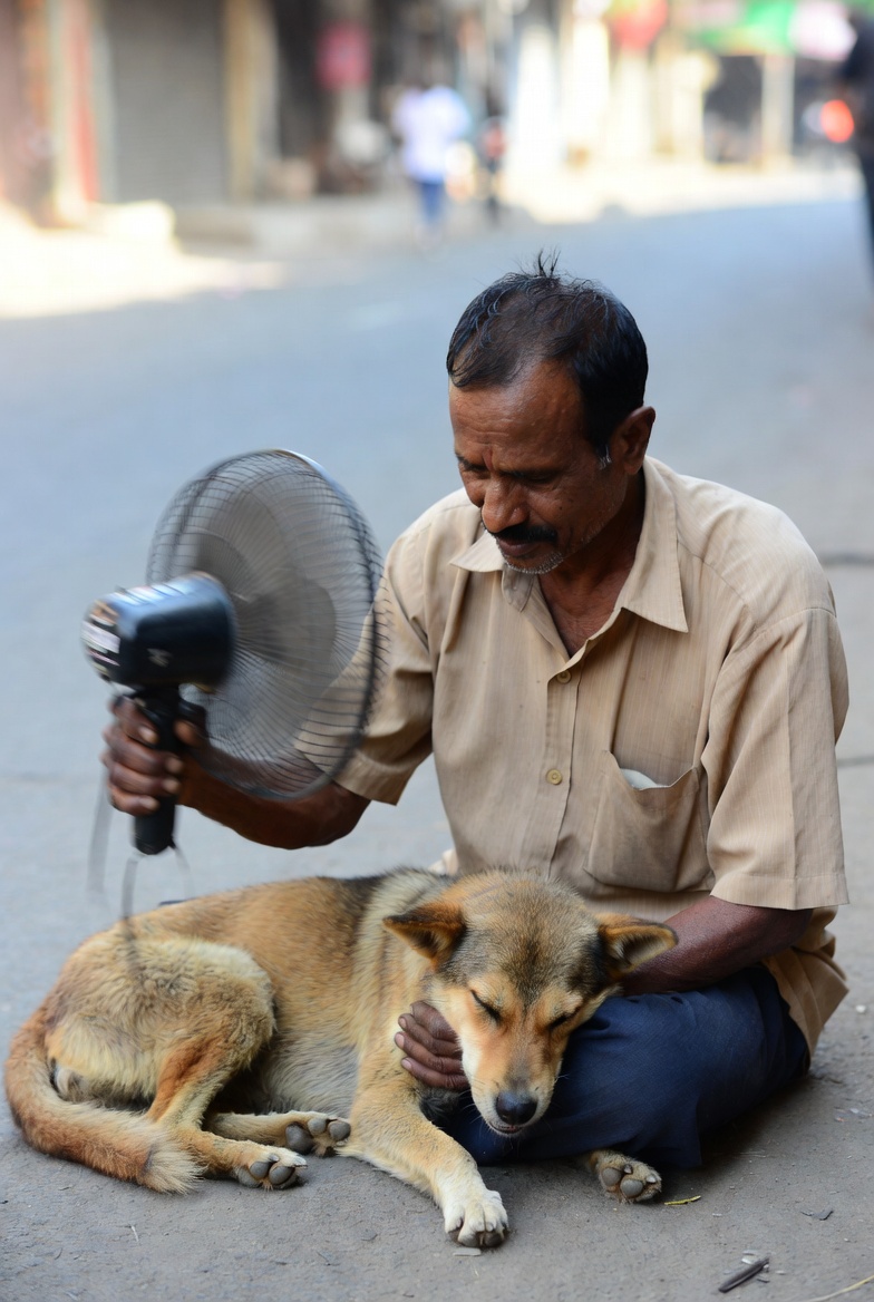 The man gently fanned the dog, carefully trying to cool it down from the intense heat. 🪭🥺