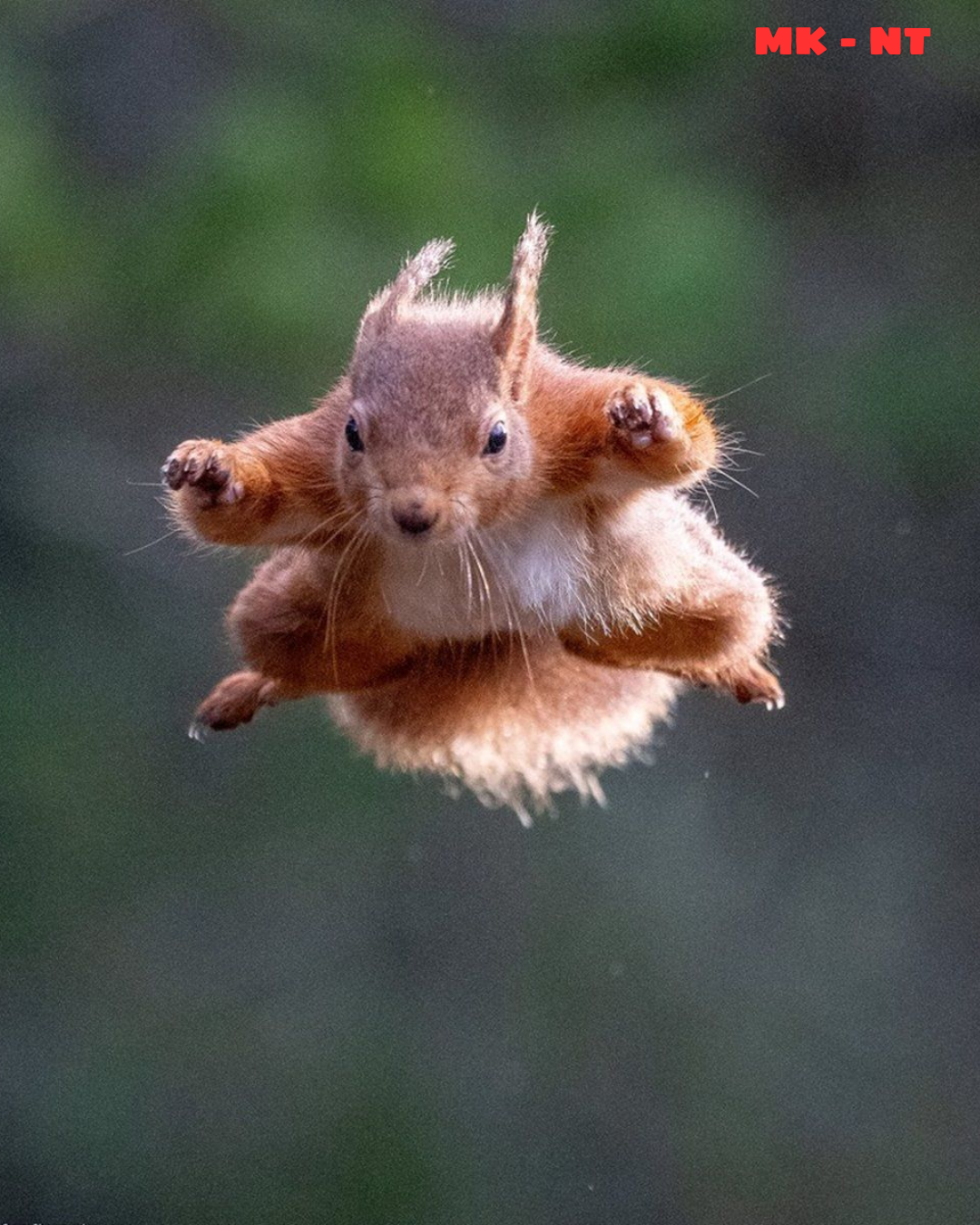 At first glance, the image almost looks unreal. The squirrel appears to be flying like a tiny superhero, floating effortlessly through the air.